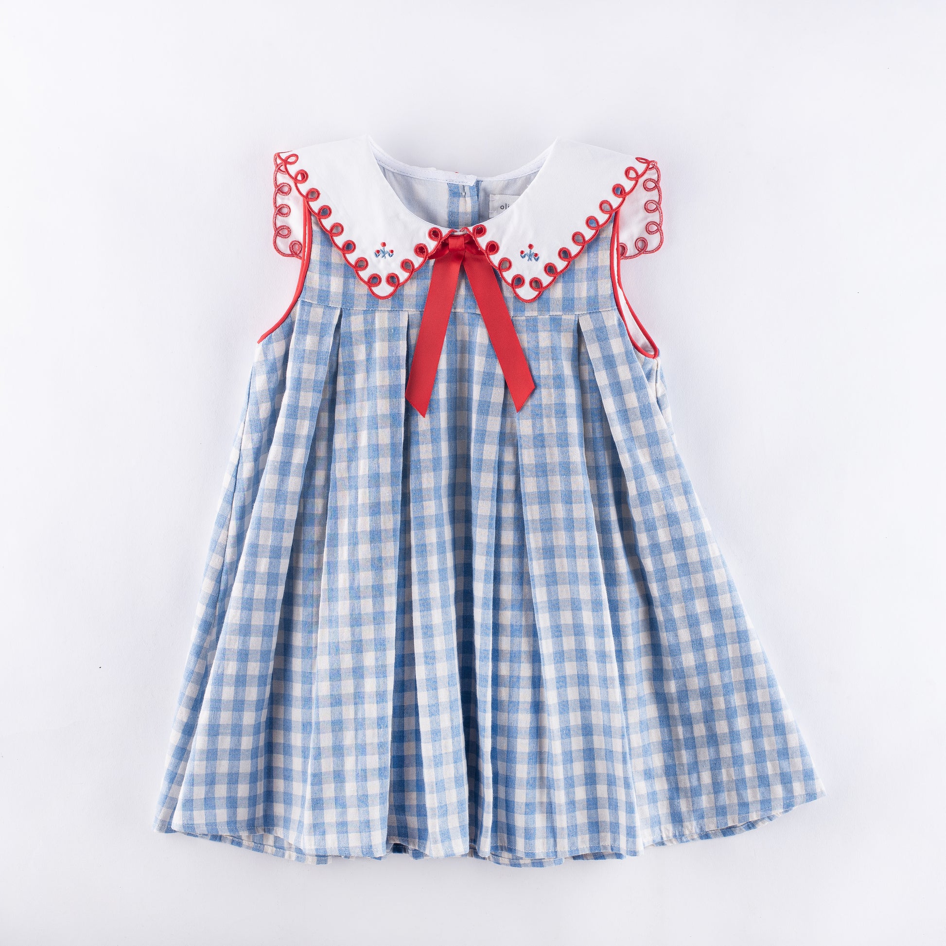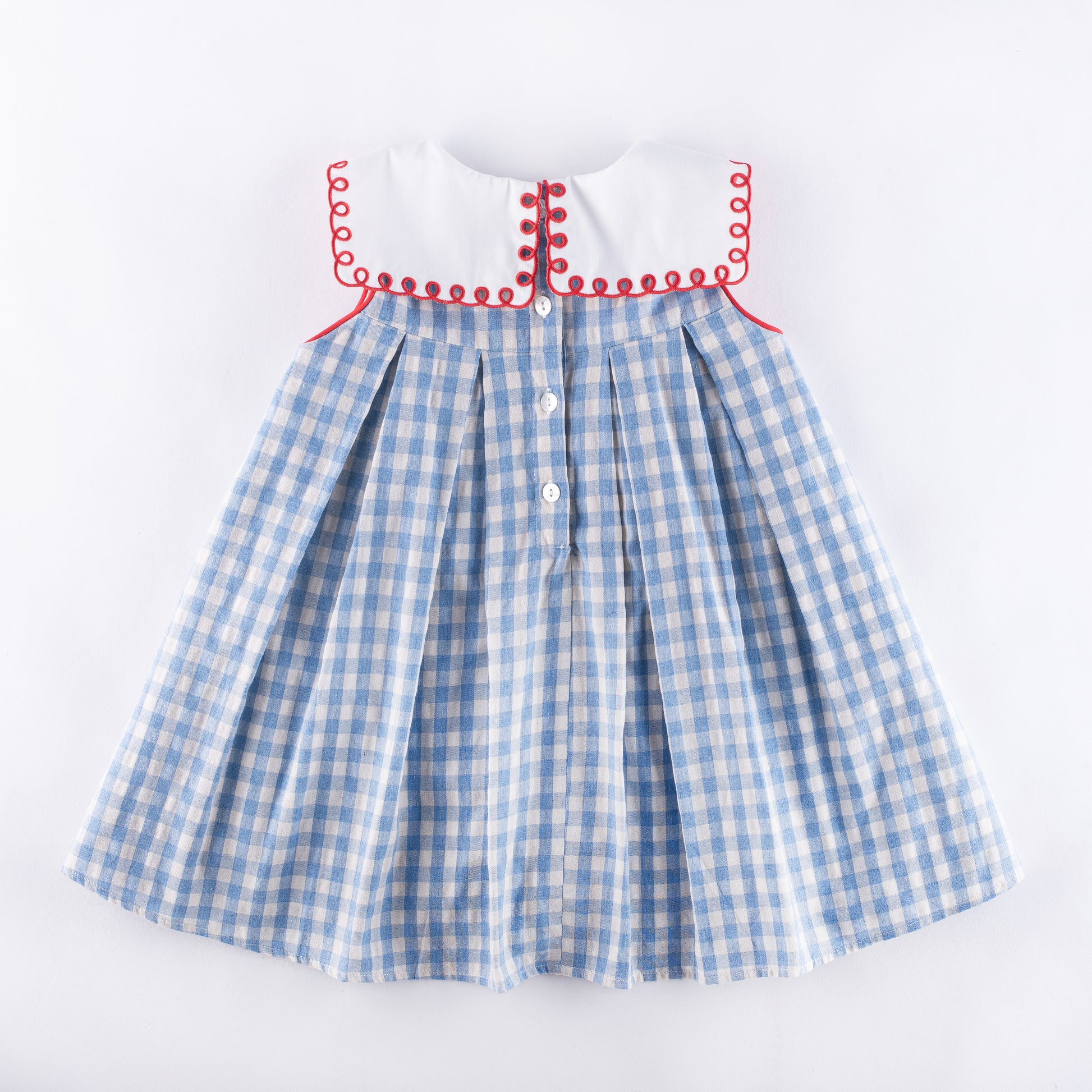 A classic—with a twist! This timeless blue and white gingham dress features an oversized white Peter Pan collar, sweet red ric-rac trim, and delicate floral embroidery that adds just the right pop of charm. With a comfy back zipper closure, it’s as easy to wear as it is to love.