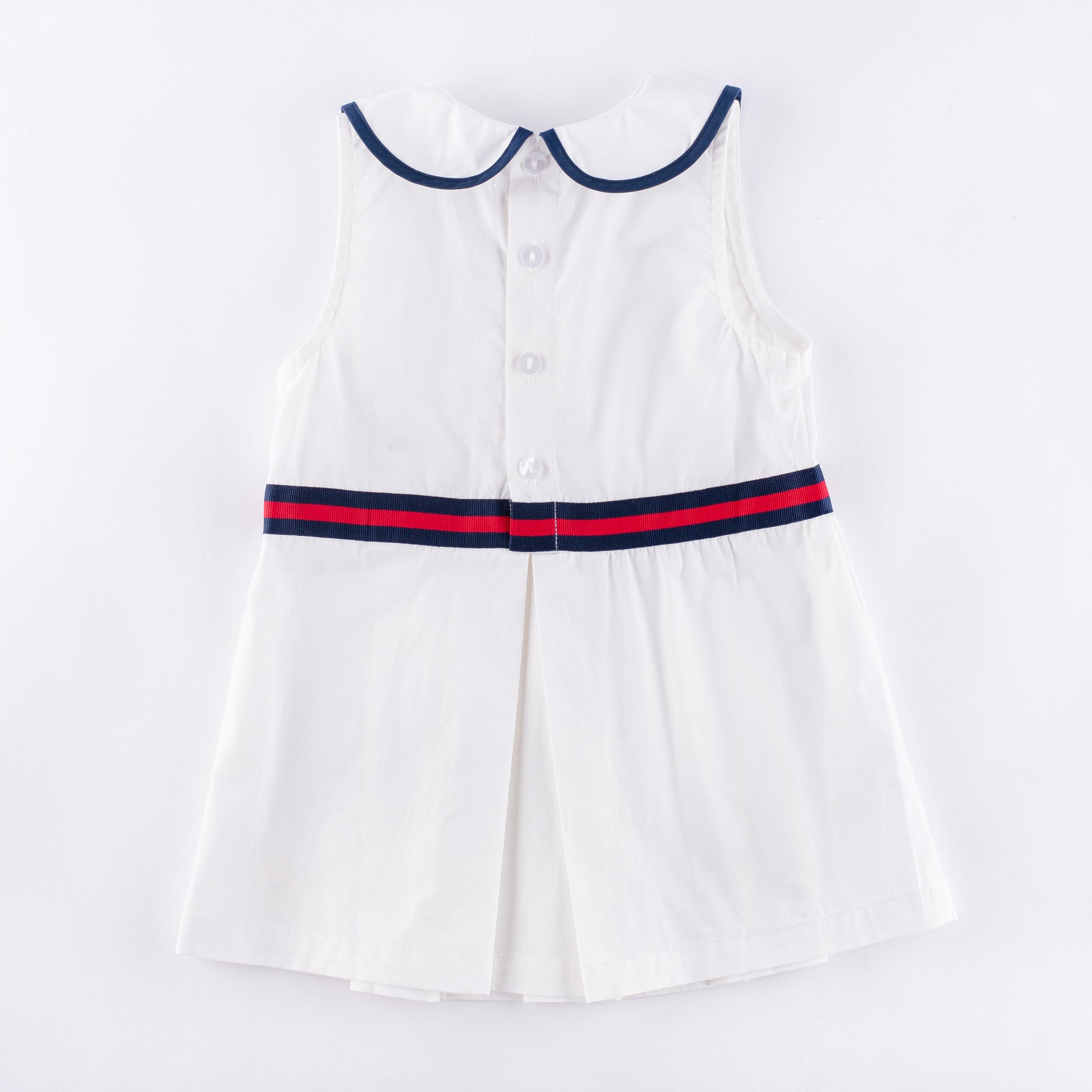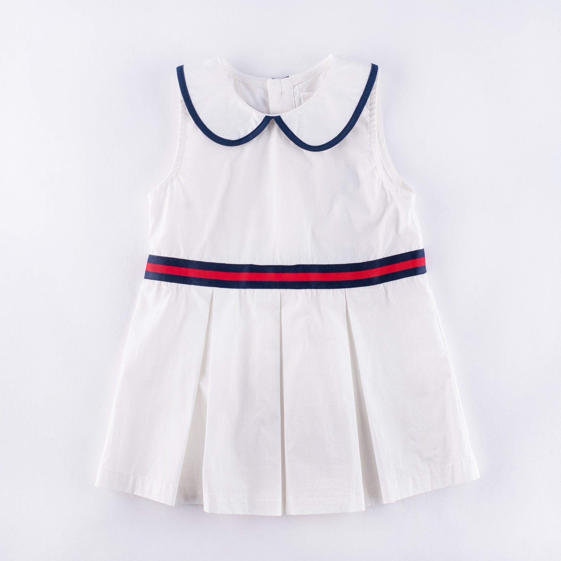 Our crisp white dress with a smart navy-and-red ribbon detail is perfect for playdates, parties, or a polished everyday look. Timeless style for your little one.